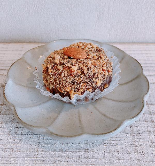 粒あんおはぎに、クラッシュした焼きアーモンドをトッピングしています。